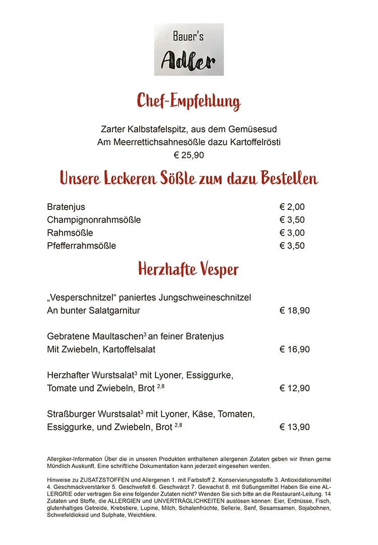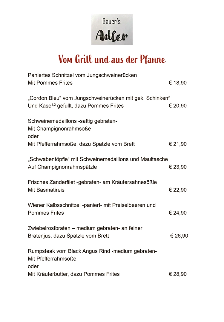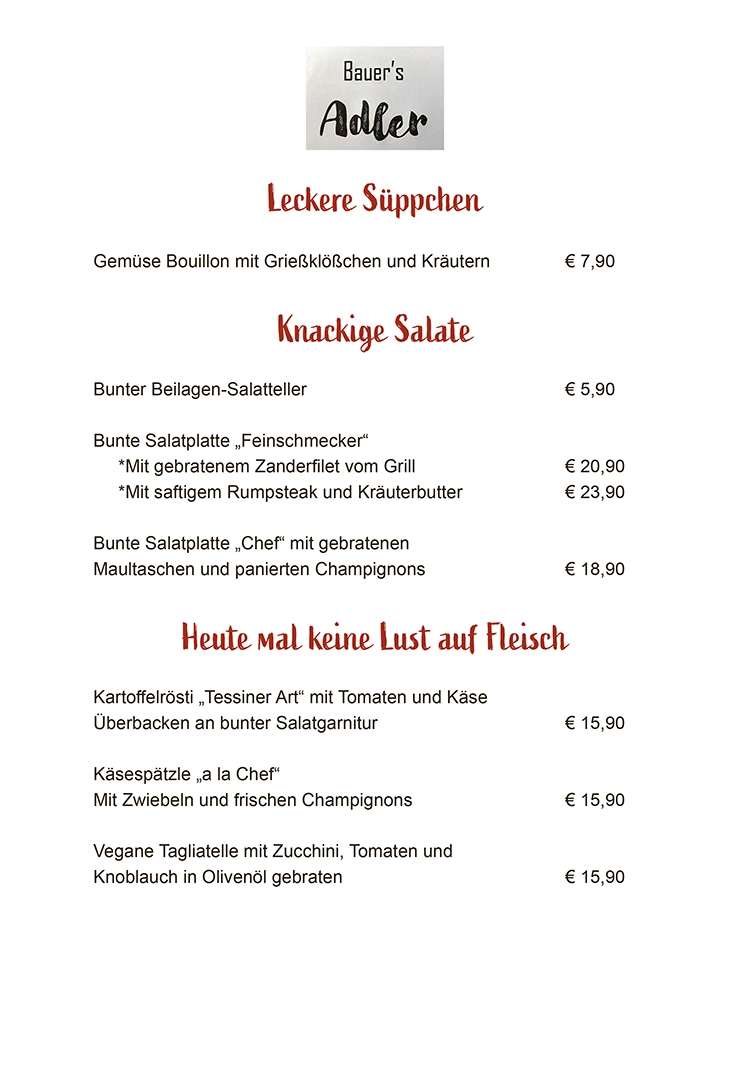 Wir freuen uns darauf, Sie mit unseren leckeren Gerichten zu verwöhnen, die immer frisch und passend zur Jahreszeit sind. Kontaktieren Sie uns per E-MailWillkommen bei Bauer`s im Adler!